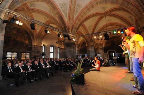 eventac zeichnete für Licht-, Ton-, und Videotechnik verantwortlich. Der akustisch sehr anspruchsvolle Krönungssaal mit seinen gotischen Gewölben und seinem harten Blausteinboden war dabei wieder einmal eine besondere Herausforderung. Mit einer dezentralen Beschallung mit Hilfe der Laustprecher von TW Audio (M15, M8 und M6) wurde ein hervorragendes Ergebnis erzielt, sodass alle Zuschauer bis in die letzten Reihen jedes Wort verstehen konnten.